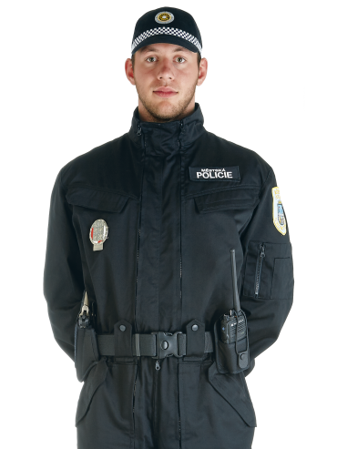 Výztuže na namáhaných místech, silné zipy, kapsy kryté patkami, odepínací poutka s druky pro opasek, poutko pro připnutí znaku MP, suché zipy vpředu a vzadu pro připnutí transparentů MP, guma v pase pro větší volnost pohybu.