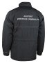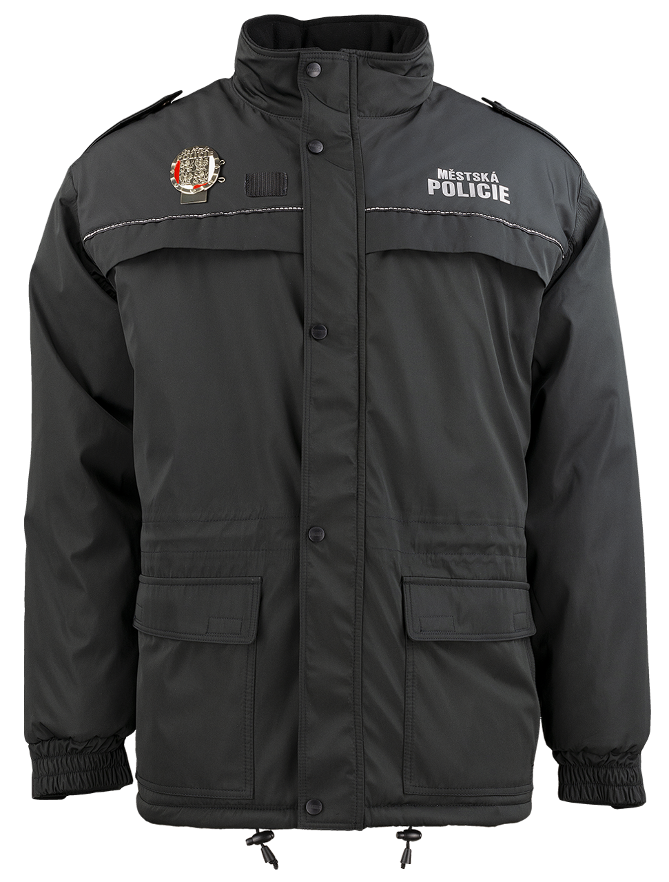 Zimní služební bunda s laminovanou klima-membránou (zajišťuje nepromokavost, větruodolnost, paropropustnost, podlepené švy), zateplená rounem z dutých umělých termoizolačních vláken.