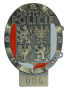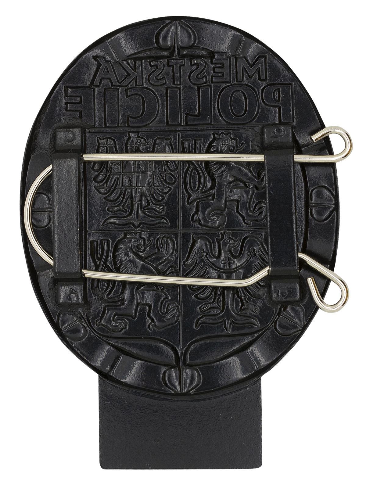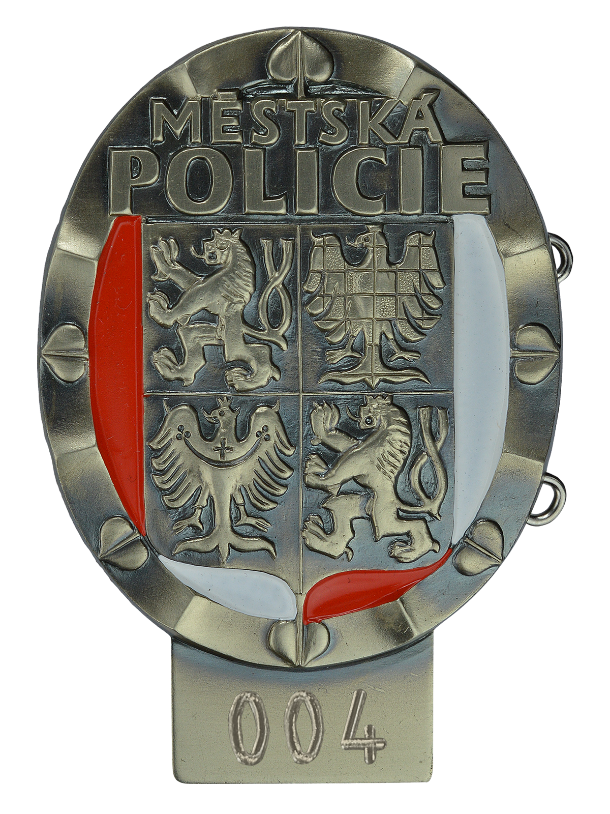 Kovový znak Městské policie ve vzoru odpovídajícím platným zákonným normám. Boční pružinka pro upevnění do poutka (zboku). Plocha pro možné vygravírování/vyrytí služebního čísla.