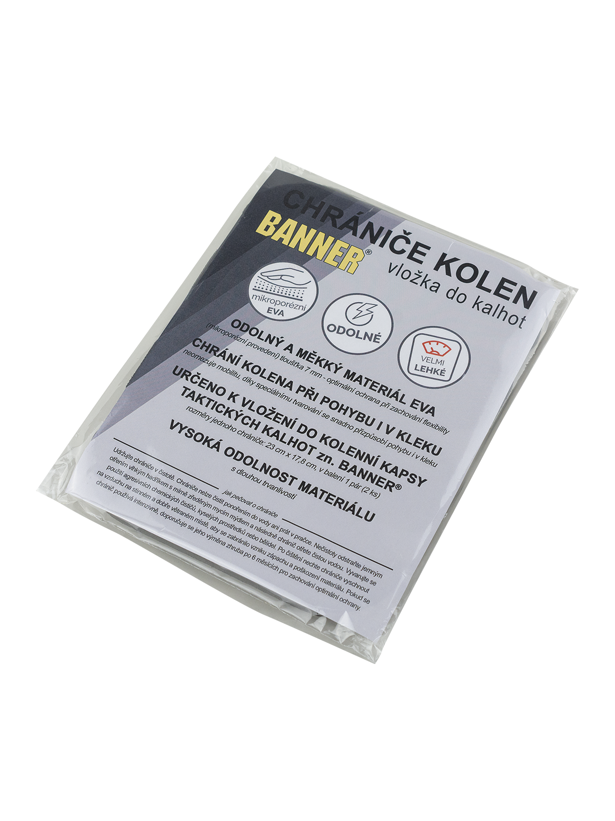 Praktické a odolné vložné chrániče kolen určené pro taktické kalhoty zn. BANNER® RAPTOR se speciální kapsou. Vyrobeny z odolného a trvanlivého materiálu EVA o tloušťce 7 mm v měkkém mikroporézním provedení. Poskytují optimální ochranu s flexibilitou v pohybu i v kleku. 1 pár (2 kusy).